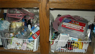 This side contains bathroom essentials that we use regularly, but not necessarily often. In the back is our travel bag with travel essentials already in it. Here are some other helpful articles for the bathroom;