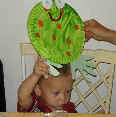 News flash: PEBS academy (in which Peter is the “P”) recently celebrated frog day. Older children learned about the life cycle of a frog while the youngest member played with his dump truck. Singing time included “Five little speckled frogs”, and children enjoyed playing leap-frog during the festivities. The highlight of the event came when the children traced their hands, cut them out, and glued them to paper plates that had previously been finger-painted to look like frogs. Each frog was given two paper eyes and a pipe-cleaner mouth. Peter was given his frog as the activity is better suited for slightly older children.
