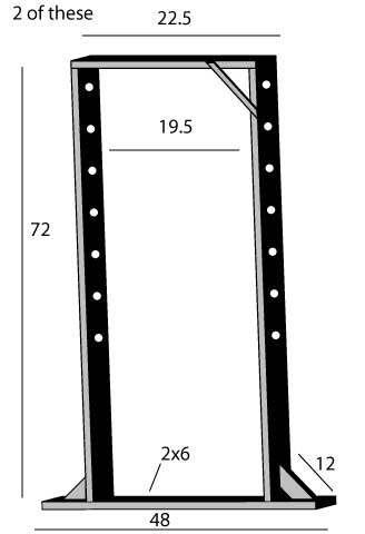 (4 – 2×4) height 72″ — ends up being 75 after you add the top and bottom boards (2 – 2×6) base width 48″ (2 – 2×4) top width 22.5″ inside frame width 19.5″ ladder width 19.4″ (5 – 3/4″ oak dowel cut in half) rung width 18″ (2 – 3/4″ oak dowel) end rungs to hold ladder 26″ (2 – 3/4″ oak dowel) 3″ piece to hold support, get from scrap of other dowels (2 – 2×4) ladder length 69″ (12 rungs 6″ apart = 66″ + 1.5″ at each end) (2 – 2×4) support beam length 31″ other scraps to build the support triangles screws (2) 4″ lag bolts with nuts and washers to hold supports to ladder (2) 4″ bolts with washers and wingnuts