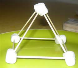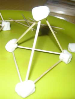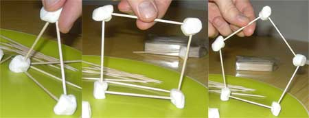 Begin by making traditional shapes like the triangle, square, and pentagon. Show them that the smaller the shape, the more stable it is. The triangle is by far the sturdiest shape. Challenge them to notice how the triangle is used in buildings, playground equipment, bridges, and other structures for support. Challenge them to build structures with the marshmallows and toothpicks and to make them stable.