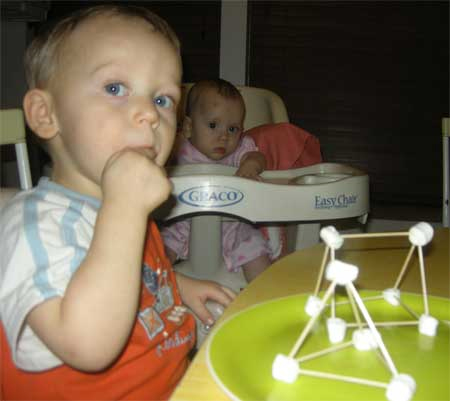 The marshmallow buildings project is a little bit advanced for the two-year-old, but I still think he got a lot out of watching his parents, and I know he enjoyed eating our creations! Marshmallows are not the most nutritious snack foods out there, and I have heard of families successfully doing this project with cubed apples, carrots, celery, and if you don’t want to eat it, modeling clay.