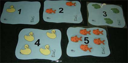 I initially made the math pond for ducks during a week when I was focusing on the color yellow. There are two songs I used for the ducks, as I placed the corresponding number in the ponds.Five Yellow Ducks