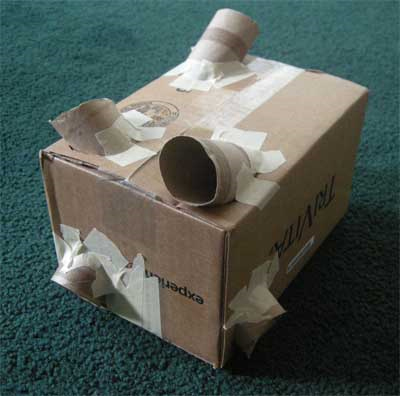 Note that there are no mirrors, so technically this is not a true periscope, but that’s okay. Cut an Three ovals the same width as the paper towel rolls on the top of the box and adjust to fit. Cut smaller ovals around the bottom and push the paper-towel rolls through. In the book, it recommended covering the box with contact paper to make it cute, but I knew that it the toy wouldn’t last forever and would be “loved” in the trying ways young children love their toys, so I spent very little time making the box look cute, and focused on its purpose- a device to roll small balls through.