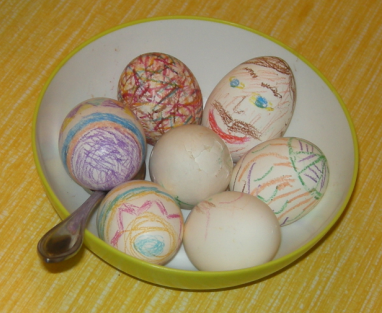 There was one activity that we followed through on, and that was boiling and decorating eggs. We simply colored them with crayons, reducing the risk of messes, and eliminating the possibility of having to eat dyed eggs. I hate it when the dye goes through the shell! My husband decorated the cutest ones, including Humpty Dumpty.
